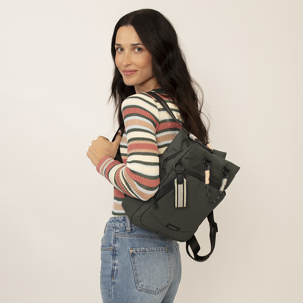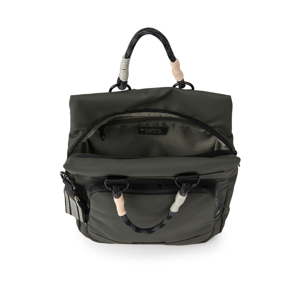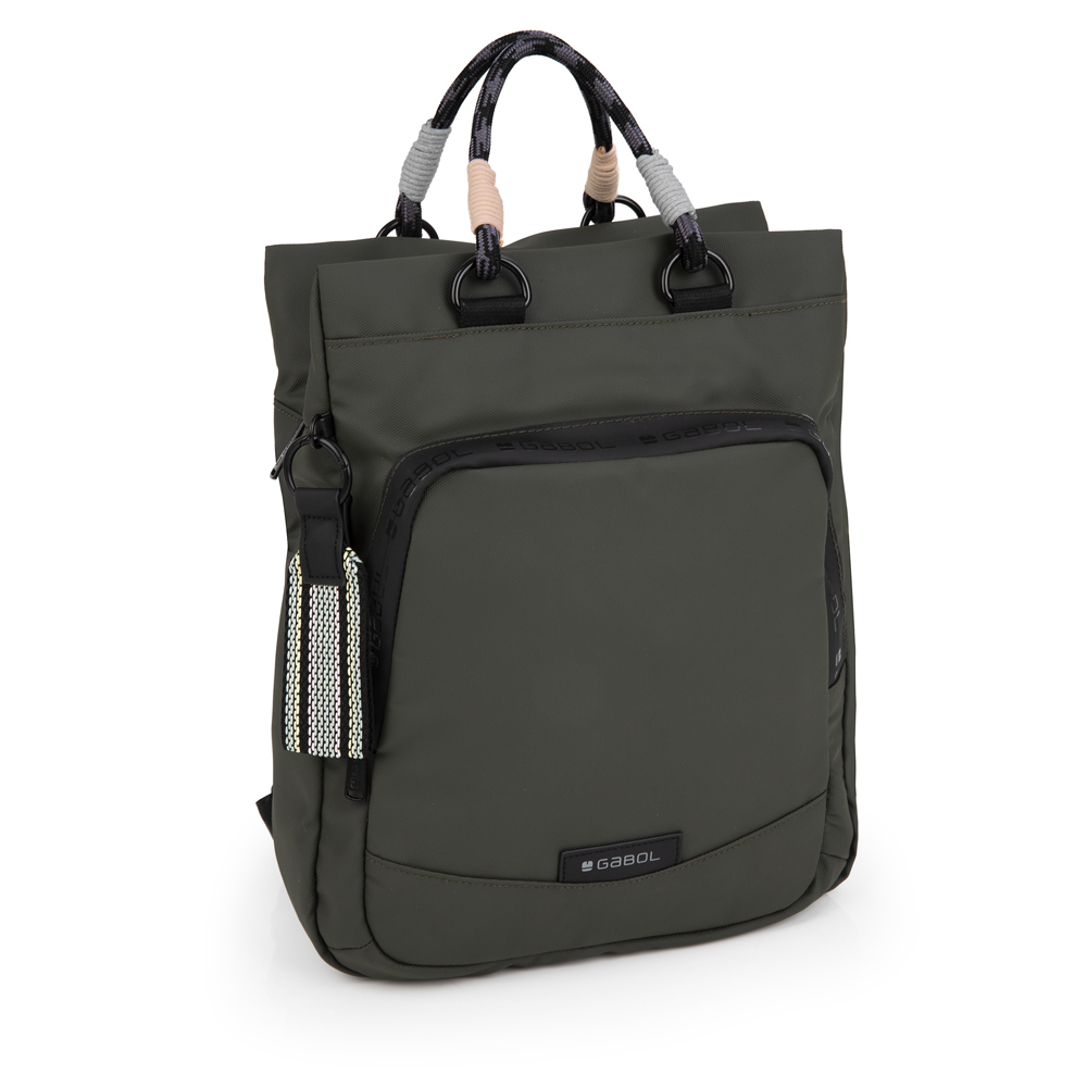 Izuzetan model ranca iz najnovije Gabol kolekcije, izradjen od poliestera, materijala bez PVC primesa. Kompaktan je, dobro organizovan, sa dekorativnim drškama od duplog učkura u sivo-crnoj boji, sa pastelnim detaljima, koje nam omogućavaju da ga nosimo u ruci, ukoliko ne želimo da ga nosimo na ledjima. Sa prednje strane se nalazi velika dodatna pregrada u koju možete smestiti svakodnevne sitnice: dokumenta, telefon, novčanik. Uz svaki ranac dobija se dekorativni, vezeni privezak.