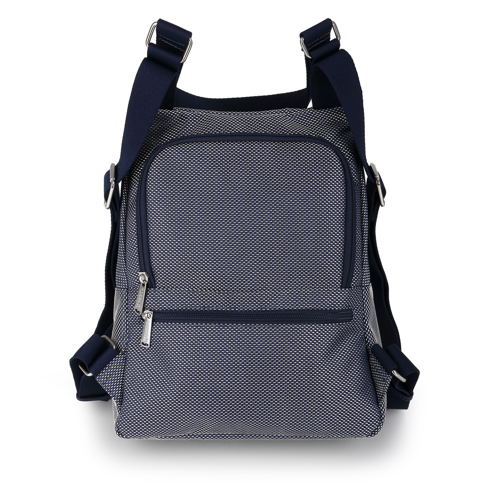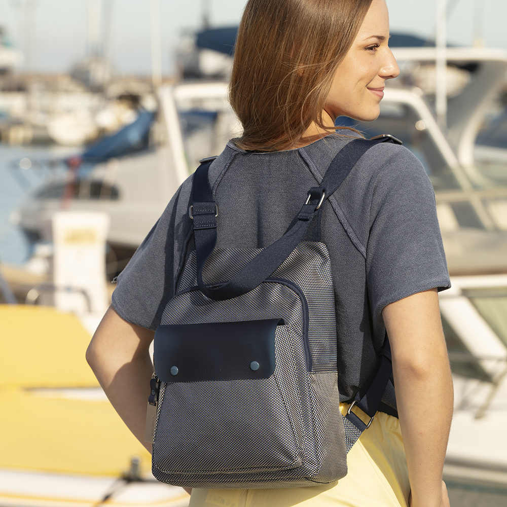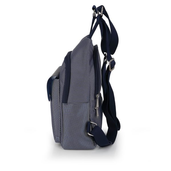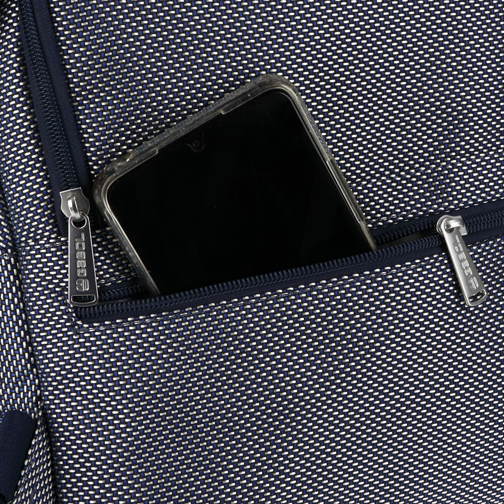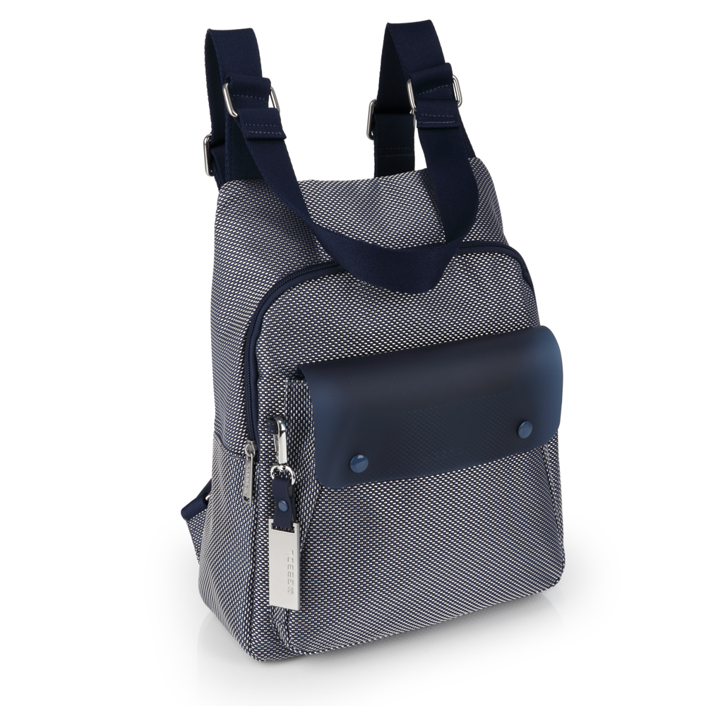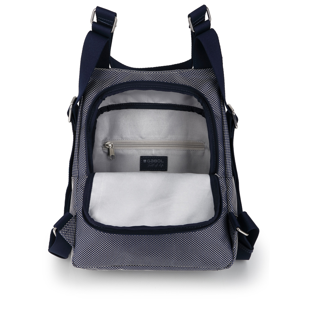 Moderan Gabol ženski ranac spaja upečatljivu teksturu i vrhunsku funkcionalnost u dizajnu prilagođenom dinamičnom gradskom životu. Izrađen je od čvrstog pletenog materijala u teget-beloj kombinaciji, dok prednju stranu krasi veliki teget džep sa polutransparentnim efektom i dekorativnim kopčama, dajući mu savremen i tehnički izgled. Ranac nudi vrhunsku organizaciju sa prostranim glavnim odeljkom, dva praktična bočna džepa idealna za flašice, kao i skrivenom zadnjom pregradom sa patent zatvaračem za maksimalnu bezbednost dokumenata. Maksimalna udobnost osigurana je meko postavljenim naramenicama i ojačanom gornjom ručkom, dok prepoznatljivi metalni privezak i unutrašnjost sa dezeniranom postavom naglašavaju posvećenost detaljima. Ovaj lagan i izdržljiv model predstavlja savršen izbor za korisnice koje traže stilski prepoznatljiv i prostran ranac za svakodnevne obaveze, posao ili putovanja.