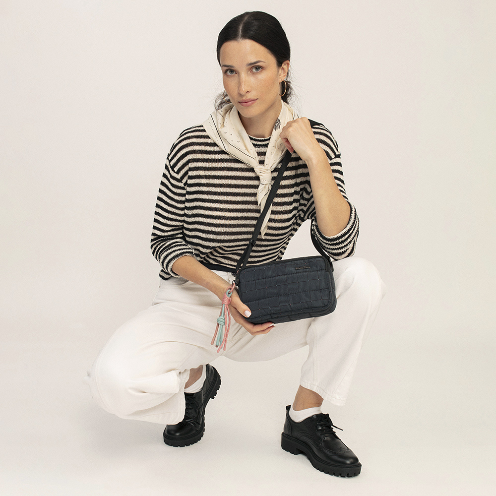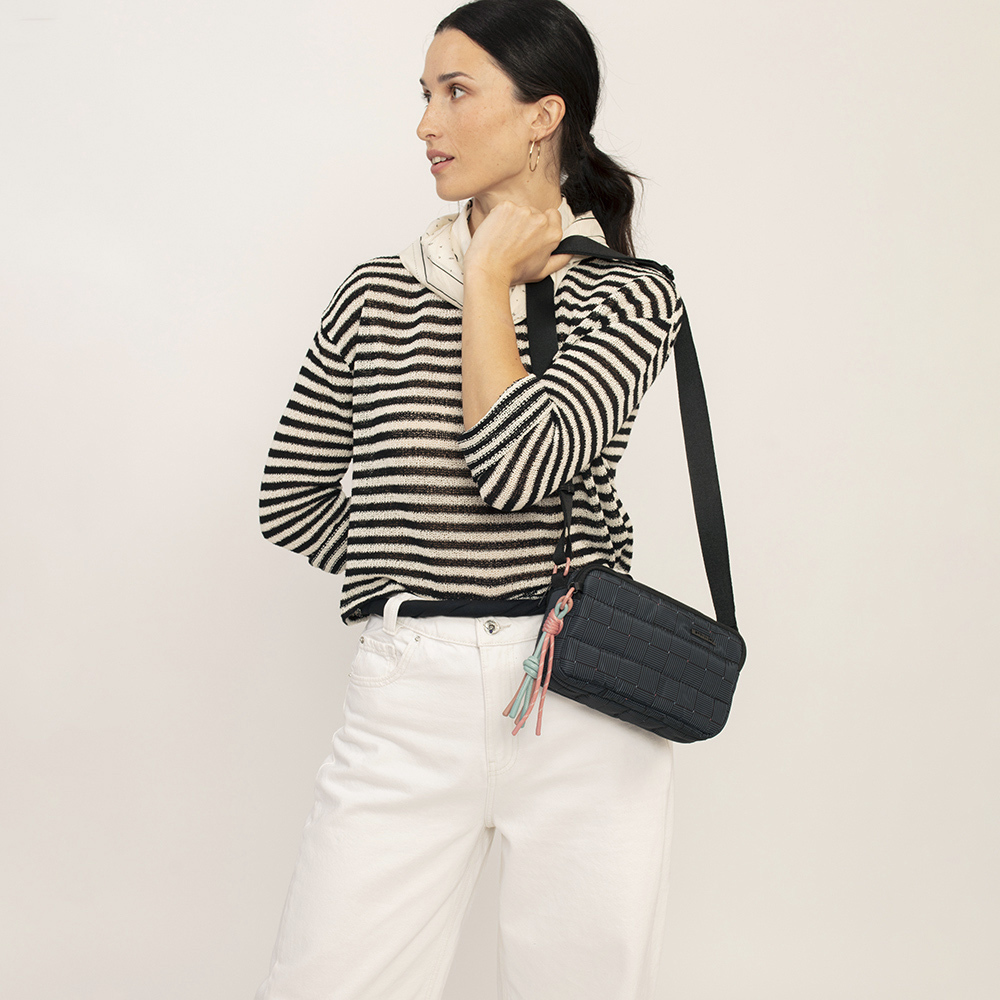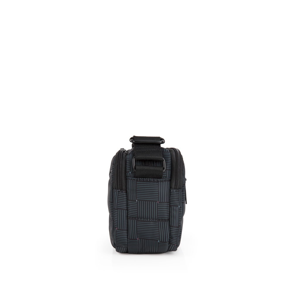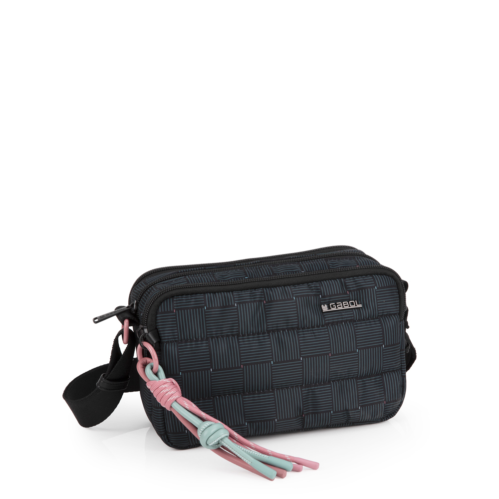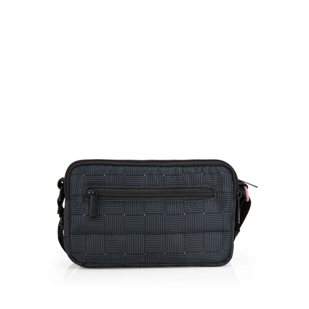 Moderna, manja ženska torba ,izradjena od poliestera, vodonepropusnog, PVC free materijala. Glavni džep se otvara sa gornje strane, i sadrži unutrašnji manji džep sa zipom. Poseduje spoljašnju pregradu koja se zatvara zipom.Svaka torba ima zakačaljku od šarenih pertli koja je čini neobičnom i drugačijom. Moderan dizajn isprepletanih kockica je čini idealnim izborom za kreativne i jedinstvene žene.
