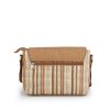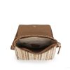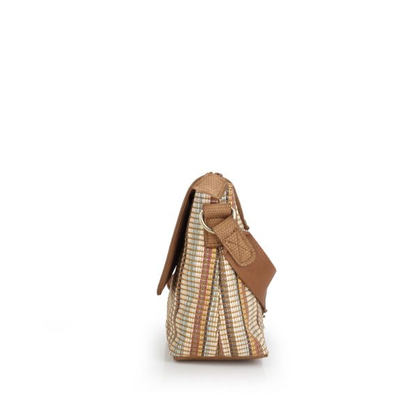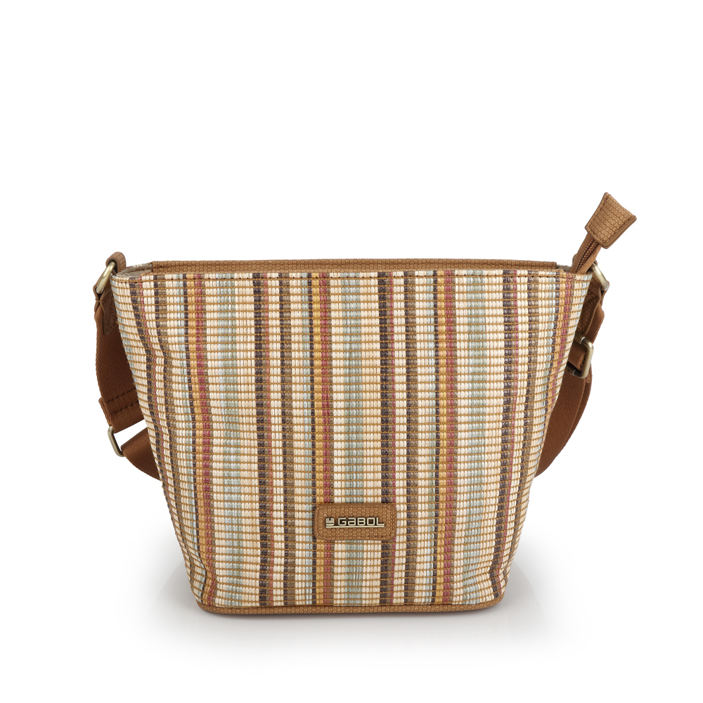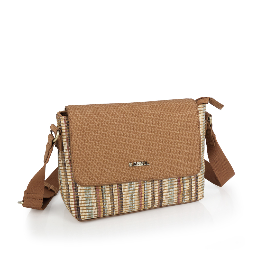 Gabol ženska torba koja predstavlja elegantnu varijaciju prepoznatljivog prugastog dizajna, upotpunjenu velikim preklopom od visokokvalitetne sintetičke kože u toploj braon nijansi. Osnovu torbe čini izdržljiva tkanina sa teksturom rafije u višebojnim vertikalnim prugama, pružajući autentičan letnji vizuelni identitet. Ovaj model nudi maksimalnu sigurnost kroz kombinaciju magnetnog zatvaranja preklopa i unutrašnjeg patent zatvarača, dok zadnji džep sa rajsferšlusom omogućava brzu dostupnost telefona ili dokumenata. Unutrašnjost je prostrana i obložena prepoznatljivom postavom na tufnice, a široki, podesivi tekstilni remen osigurava vrhunsku udobnost pri nošenju. Svojom svestranošću i toplom paletom boja, ova torba je savršen izbor za korisnice koje traže spoj klasičnog stila i modernih letnjih materijala.