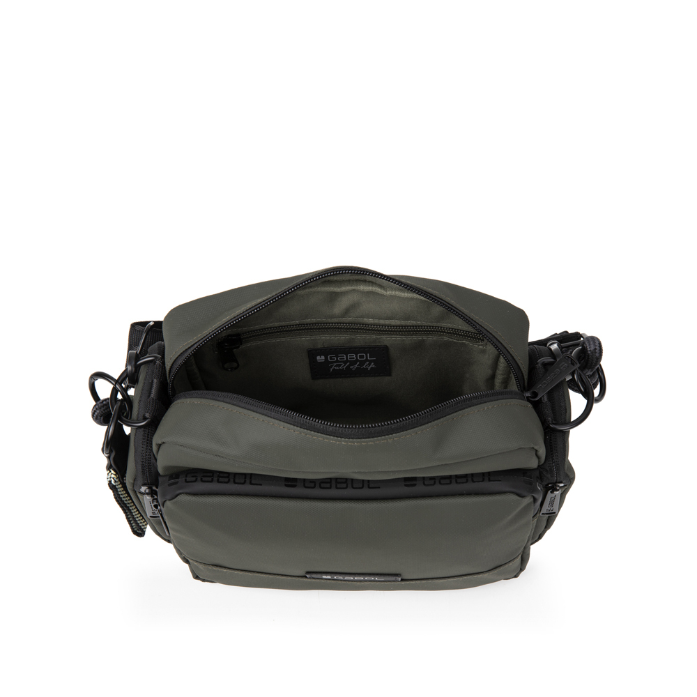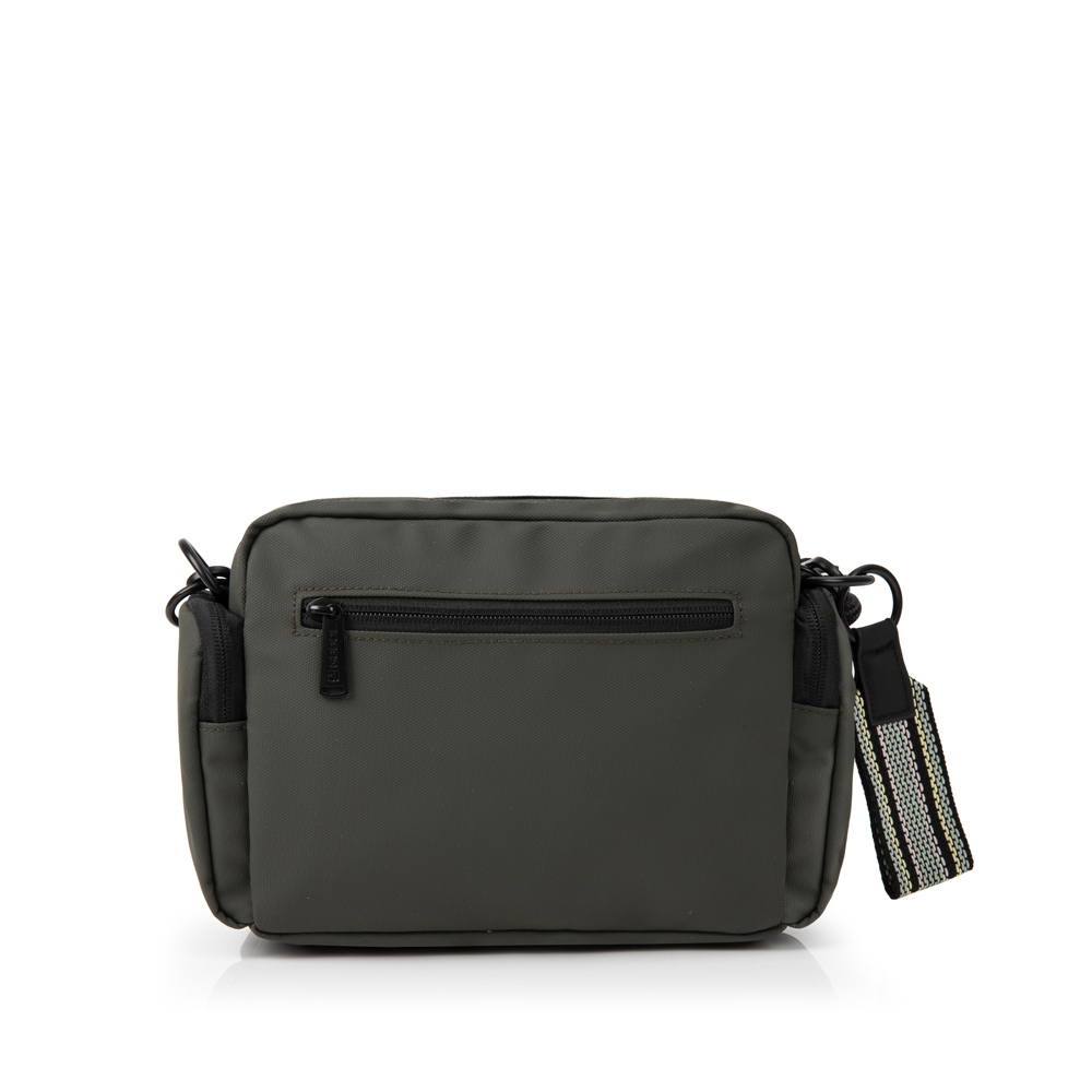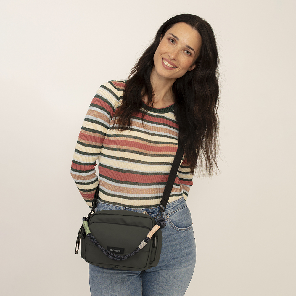 Torbica Mina je manja, ali praktična torba savršena za svakodnevne aktivnosti i večernje izlaske u maslinasto zelenoj boji. Izradjena je od kvalitetnog poliestera, materijala bez PVC primesa. Poseduje jednu glavnu pregradu u kojoj se nalazi dodatni unutrašnje džep sa sitnice. Na prednjoj i zadnjoj strani se nalaze dodatni džepovi koji se zatvaraju zipom. Na bočnim stranama se nalaze dodatni džepovi koji ovaj model čine idealnim za sve ljubiteljke torbi sa velikim brojem džepova. Svaka torba ima kaiš za nošenje preko ramena, ali i dodatnu ručku izradjenu od duplog učkura u sivo-crnoj boji, sa pastelnim detaljima. Uz svaku torbu se dobija i dekorativni, vezeni privezak.