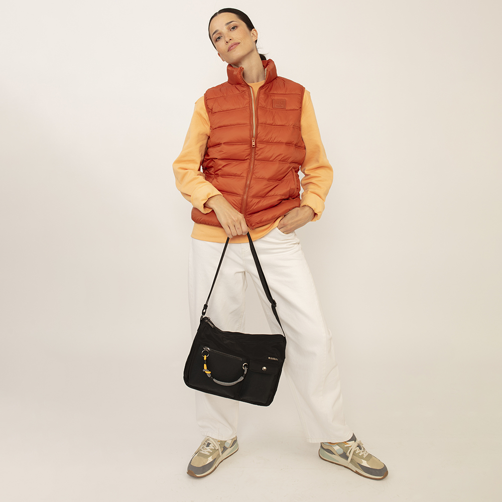 Torba ženska Aisha je torba za svakodnevnu upotrebu. Izradjena od kombinacije kvalitetne sintetičke kože i sintetičkog poliestera, bez PVC primesa, koji osigurava dugotrajnost i lako održavanje. Sadrži dve glavne pregrade, za bolju organizaciju vaših stvari. Sa prednje strane se nalaze dva džepa, jedan se zatvara dugmetom i idealan je za telefon, a u drugi možete smestiti lična dokumenta, ključeve i druge svakodnevne sitnice. Na prednjem džepu se nalazi atraktivni privezak od zebrastih pertli sa narandžastm detaljima. Ovaj model je idealan za žene koje vole veliki broj džepova i lako uklopiv dizajn.