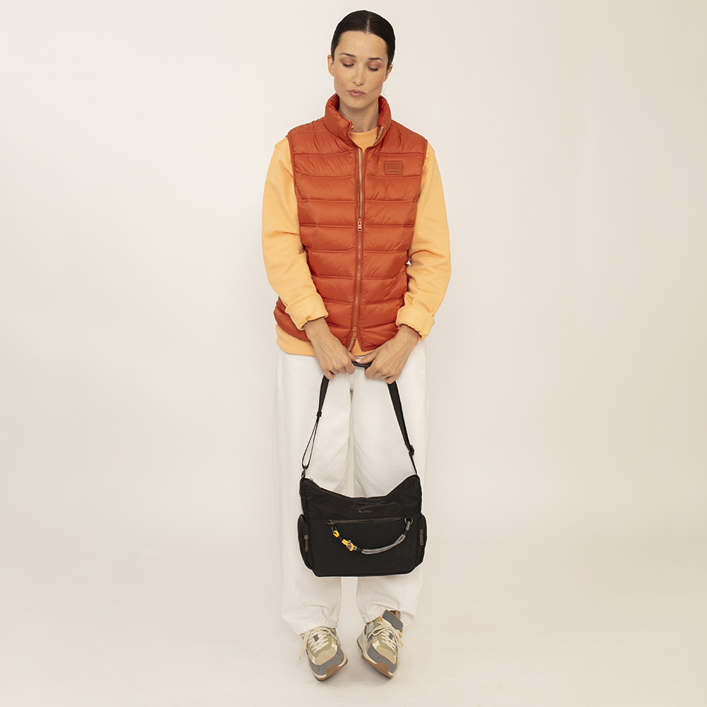Torba ženska izradjena od kombinacije sintetičke kože i sintetičkog poliestera, bez PVC primesa, sa kaišem preko ramena i dekorativnim priveskom izradjenim od zebrastih pertli sa narandžastim detaljima. Torba ima idealnu organizaciju: prednji džep, jedna glavna pregrada sa unutrašnjim malim odeljkom, sa zadnje strane se nalazi još jedan dodatni džep, svi sa zip zatvaranjem. Na bočnim stranama se nalaze dodatni džepovi, koji ovaj model čine idealnim za sve ljubiteljke torbi sa velikim brojem džepova.