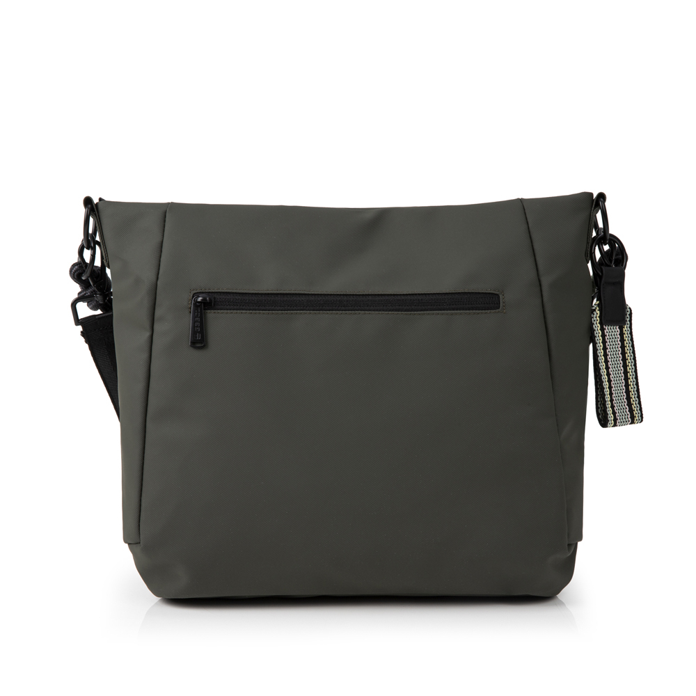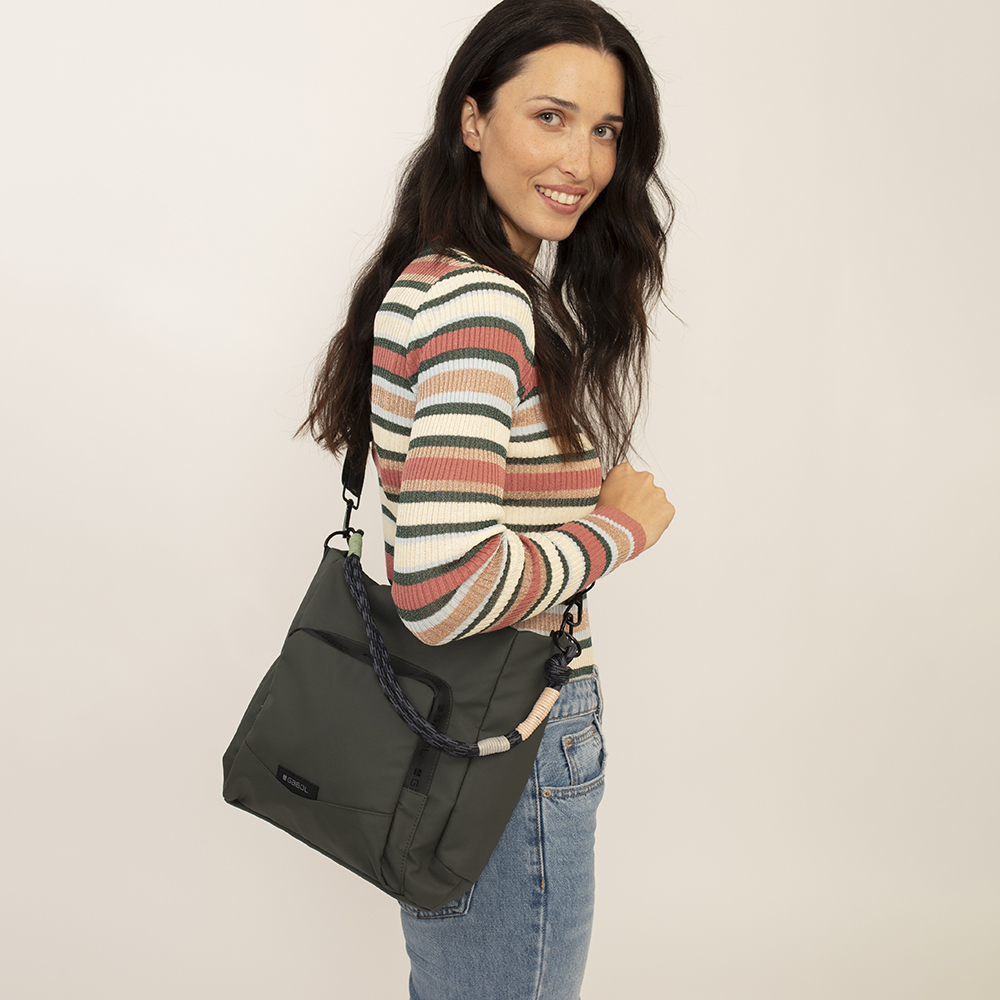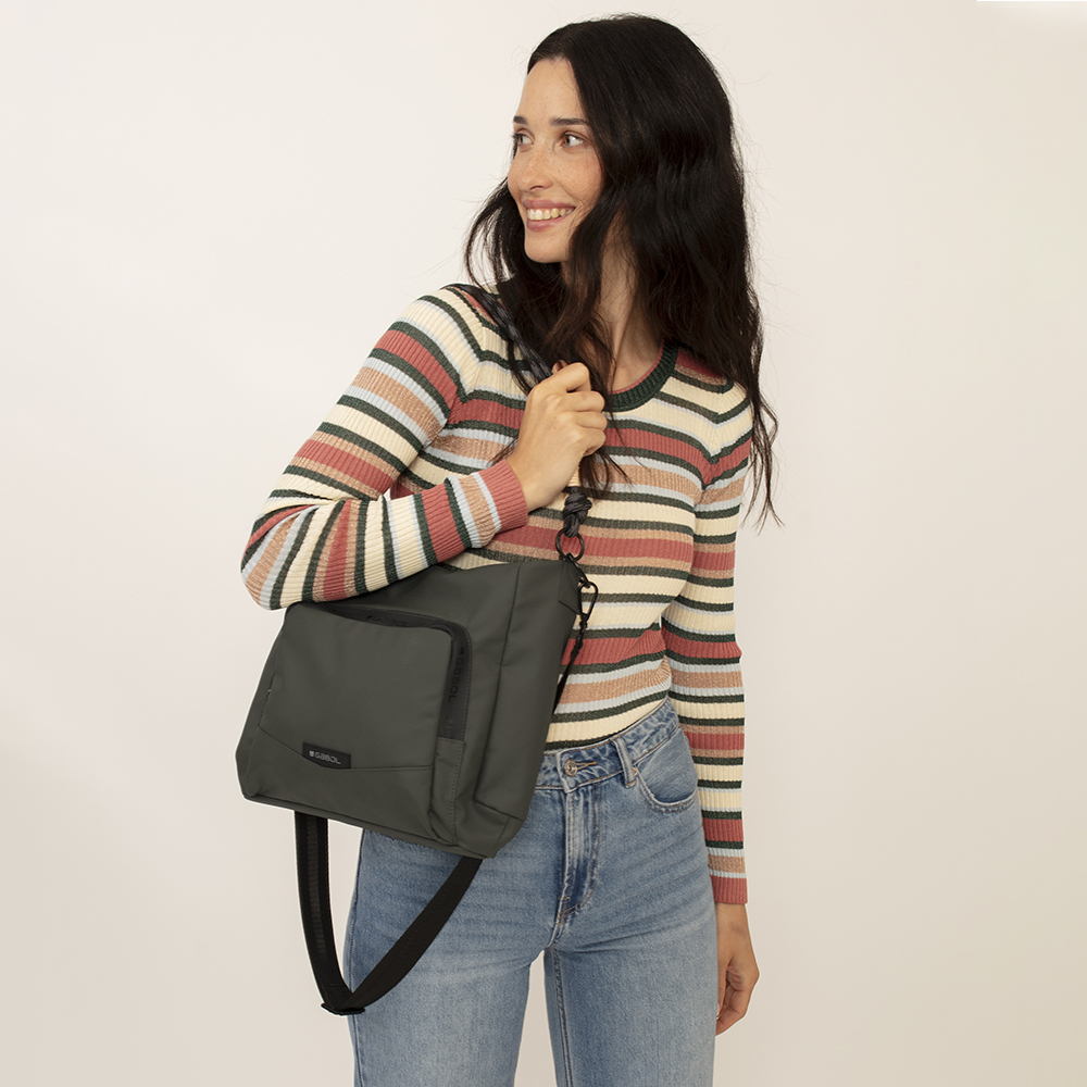 Velika ženska torba za svakodnevnu upotrebu. Izradjena od poliestera, bez PVC primesa, koji osigurava dugotrajnost i lako održavanje. Sadrži jednu glavnu pregradu, sa dodatnim unutrašnjim džepom za bolju organizaciju vaših stvari. Sa prednje strane se nalazi dodatni džep u koji možete smestiti lična dokumenta, ključeve, telefon i druge svakodnevne sitnice. Sa zadnje strane se nalazi dodatni džep koji se zatvara zipom. Svaka torba ima kaiš za nošenje preko ramena, ali i dodatnu ručku izradjenu od duplog učkura u sivo-crnoj boji, sa pastelnim detaljima. Uz svaku torbu se dobija i dekorativni, vezeni privezak.